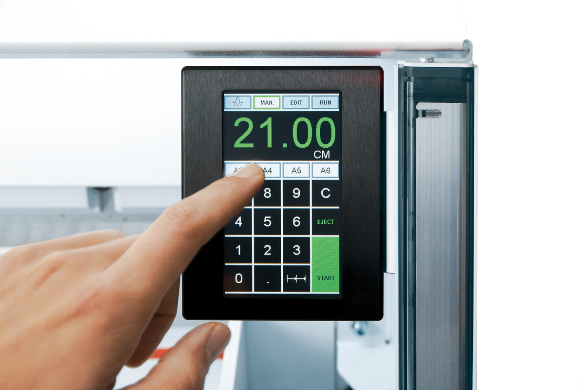 Extremely convenient: Electronic, programmable control module for the power backgauge with multi-lingual touch pad. 99 programs with 99 steps in each program can be stored.
