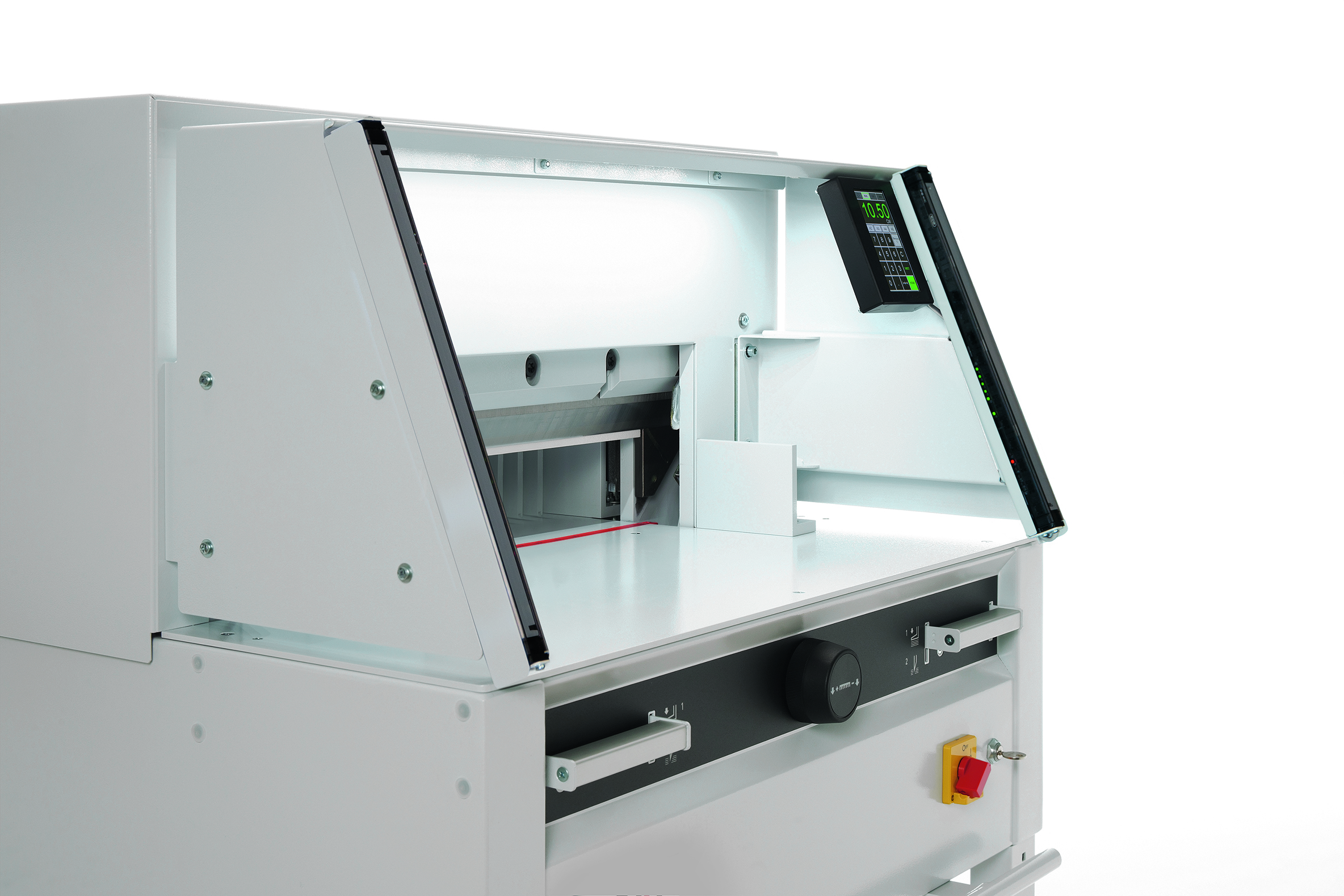 The light beam safety curtain in the working area of this professional guillotine ensures the highest level of safety and cutting convenience.