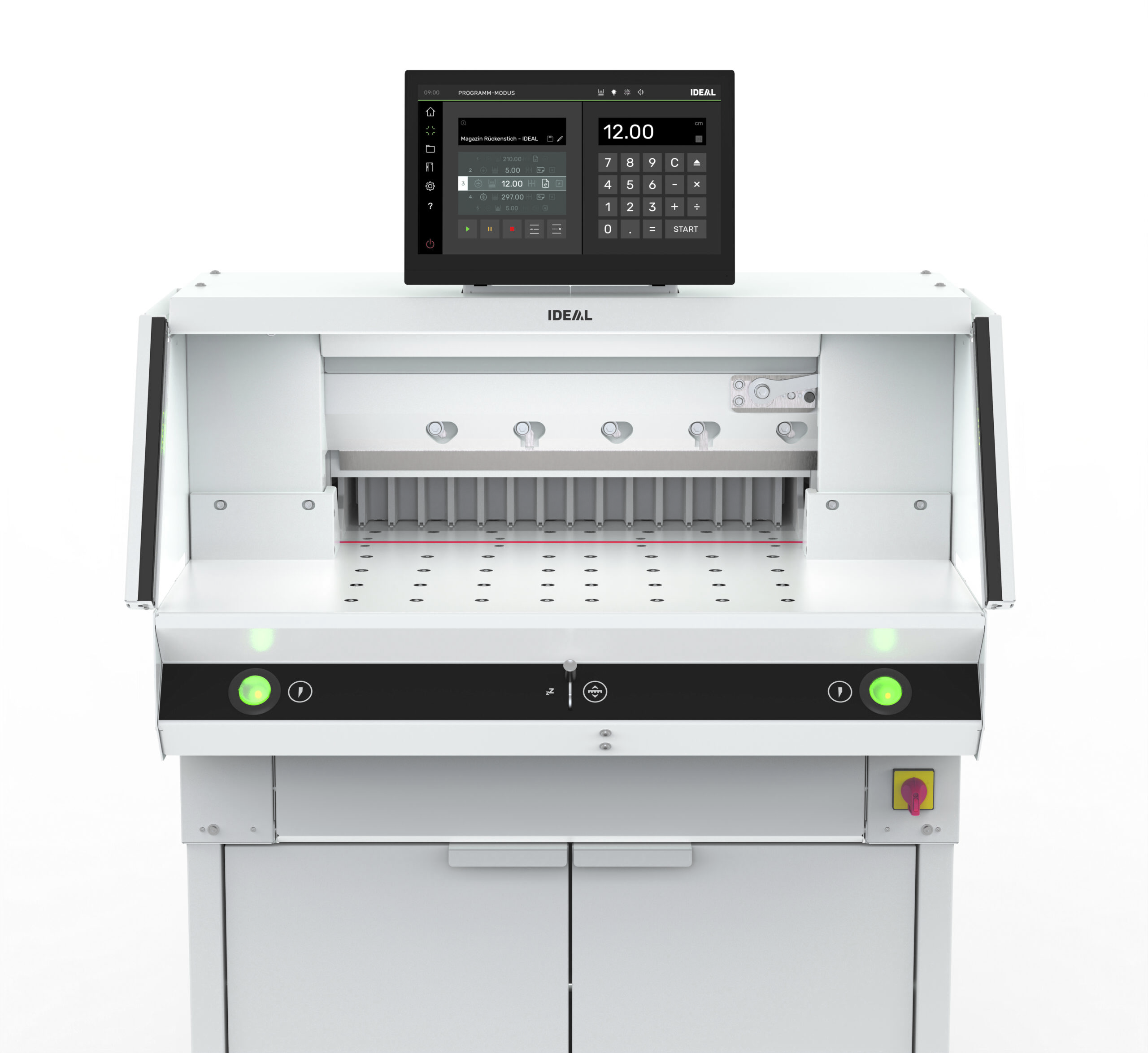 IR light beam safety curtain on the front table – with additional status indication (red/green) in the display Safety cover on the rear table Patented, adjustable machine drive with integrated safety control Main switch Code lock: optionally adjustable electronic access lock True two-hand blade activation via EASY-TOUCH buttons