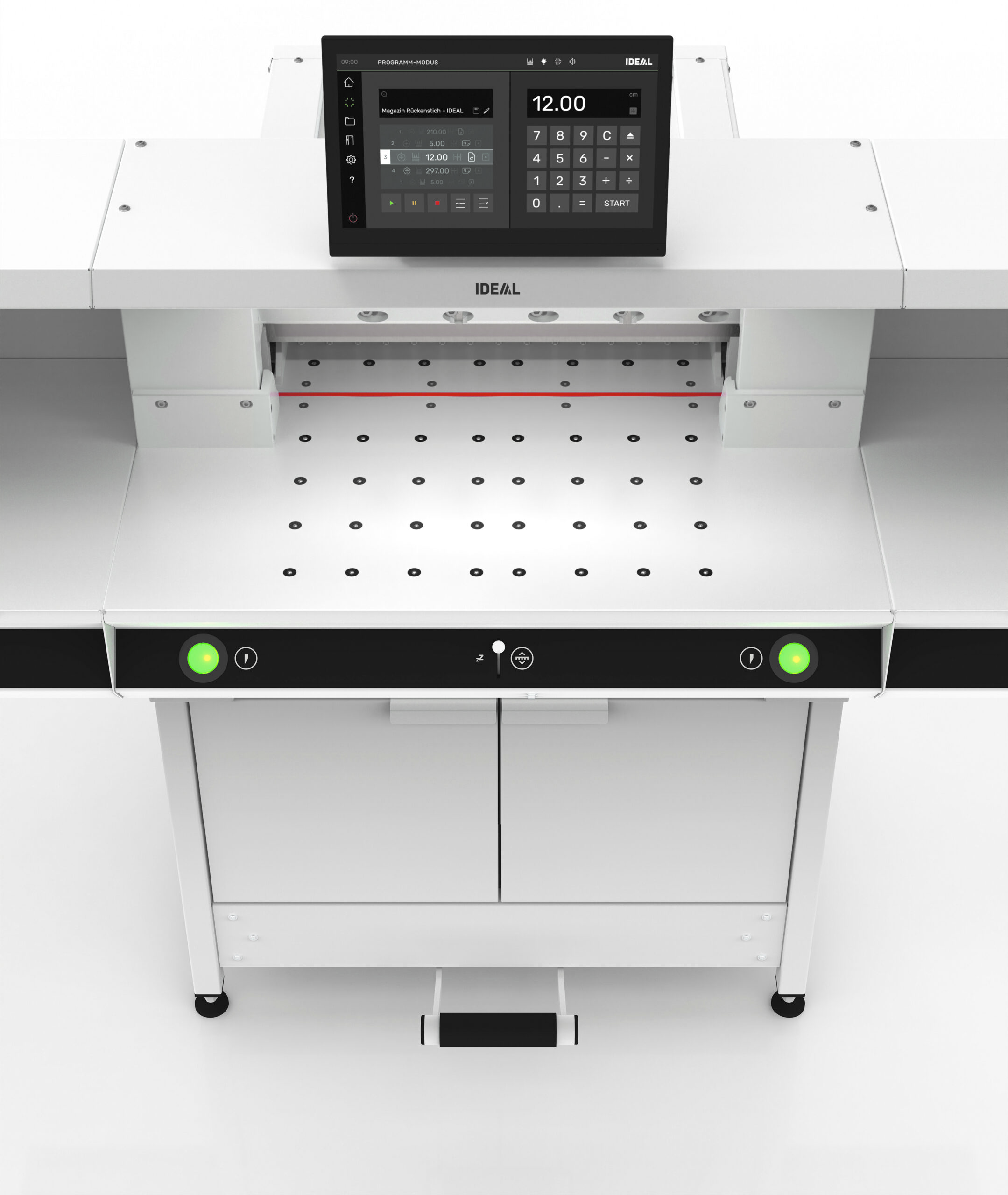 Display and operation via 15.6“ multi-touch display PRECISION DRIVE: Multi-patented, electro-mechanical precision blade drive and hydraulic clamp drive Programmable and manual backgauge positioning with optimum operator ergonomics and logic Adjustable backgauge with narrow separations and plastic gliders Spindle guided precision backgauge Clamp bar with infinitely programmable adjustment of the required clamping pressure via the touchscreen
